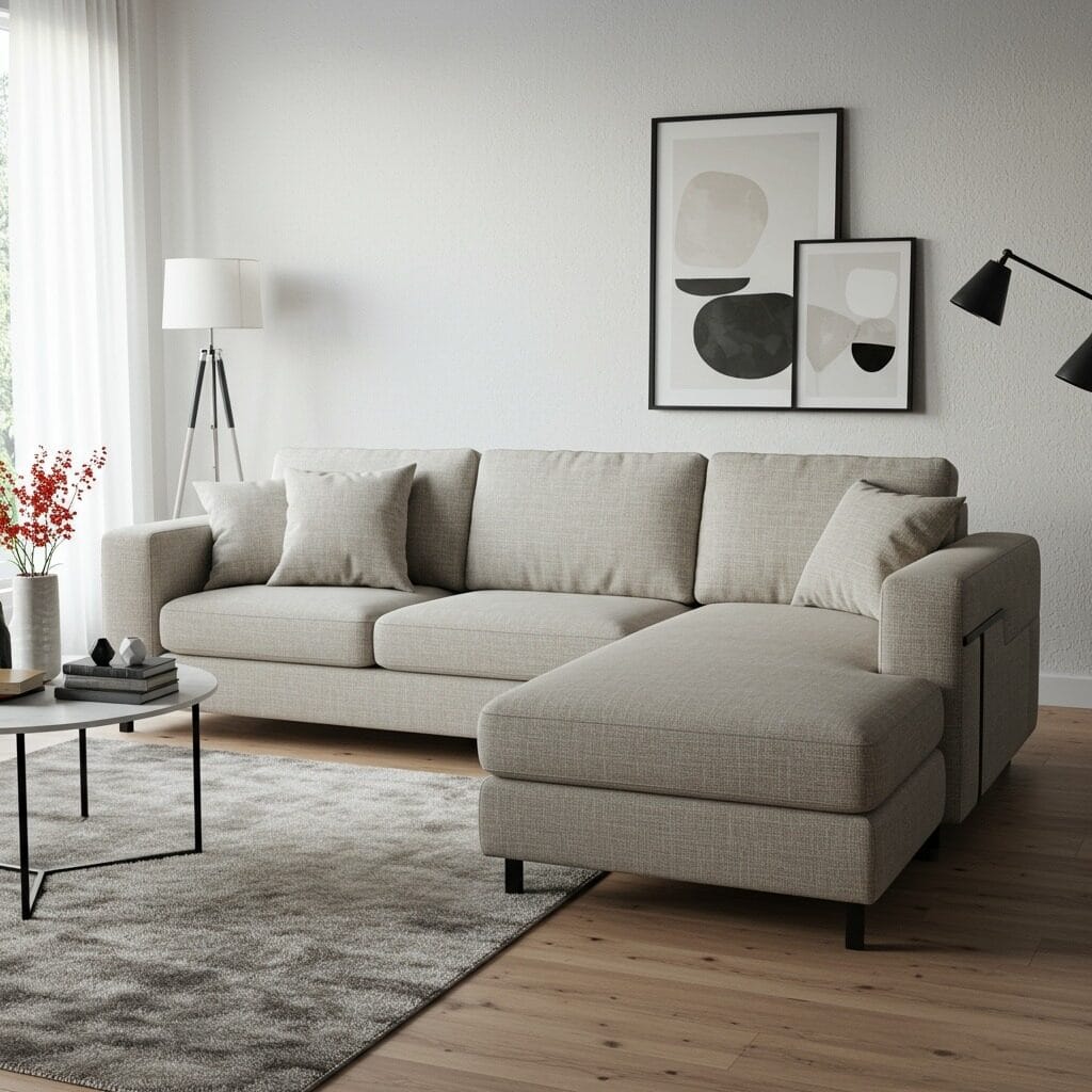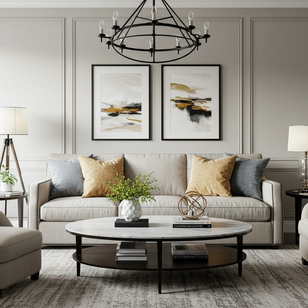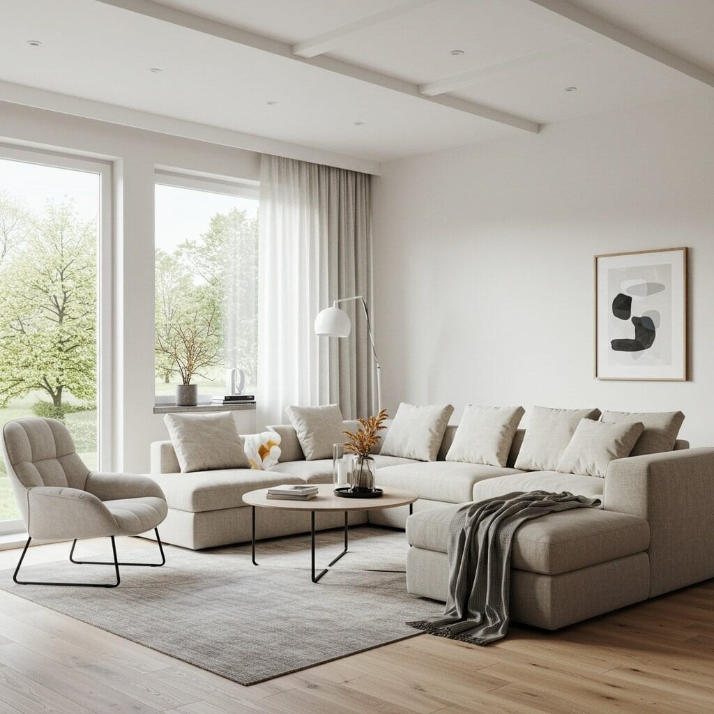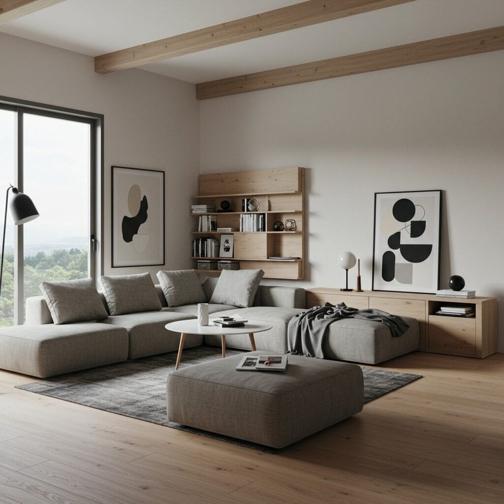 This balance prevents your room from feeling too stark while maintaining that contemporary sophistication. A cool-toned sofa paired with warm wood side tables creates perfect harmony.