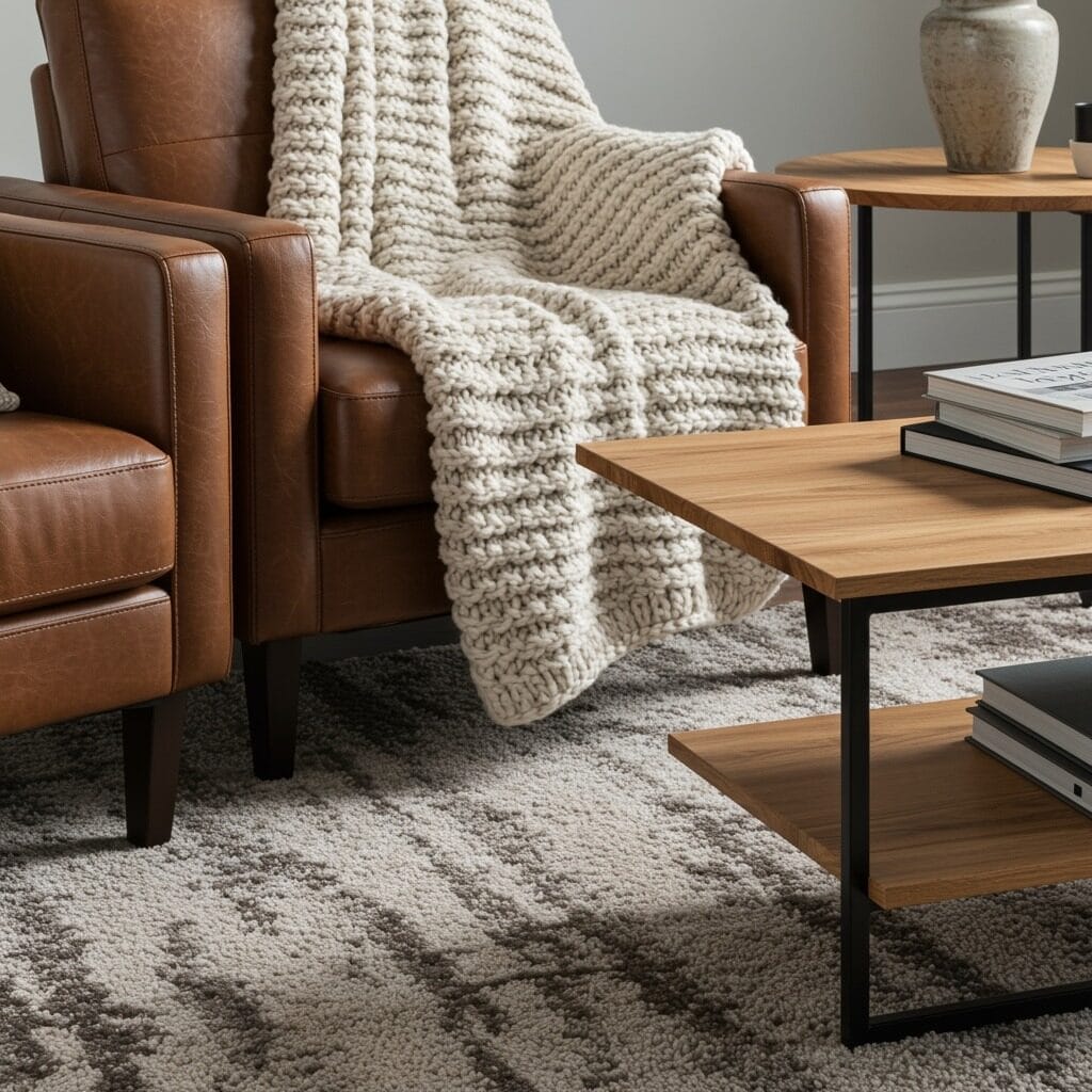 Consider a chunky knit throw draped over a smooth leather chair, or pair a glass coffee table with a jute area rug. These contrasts create visual interest while maintaining that clean, uncluttered feeling.