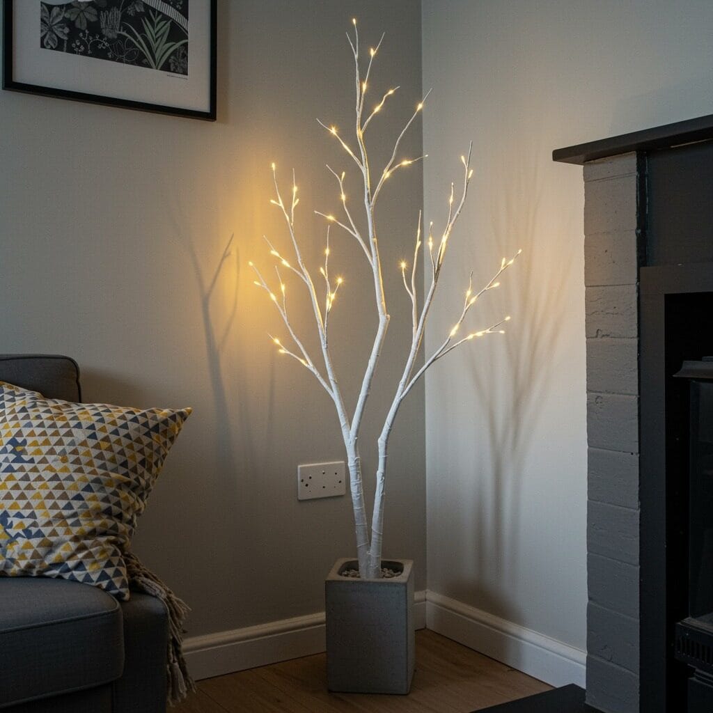 Position three to five branches of varying heights in a large ceramic or concrete planter filled with white stones. This modern take on a Christmas tree works perfectly in contemporary spaces and requires zero maintenance. The soft lighting creates beautiful shadows on walls, adding depth to your living room decor.