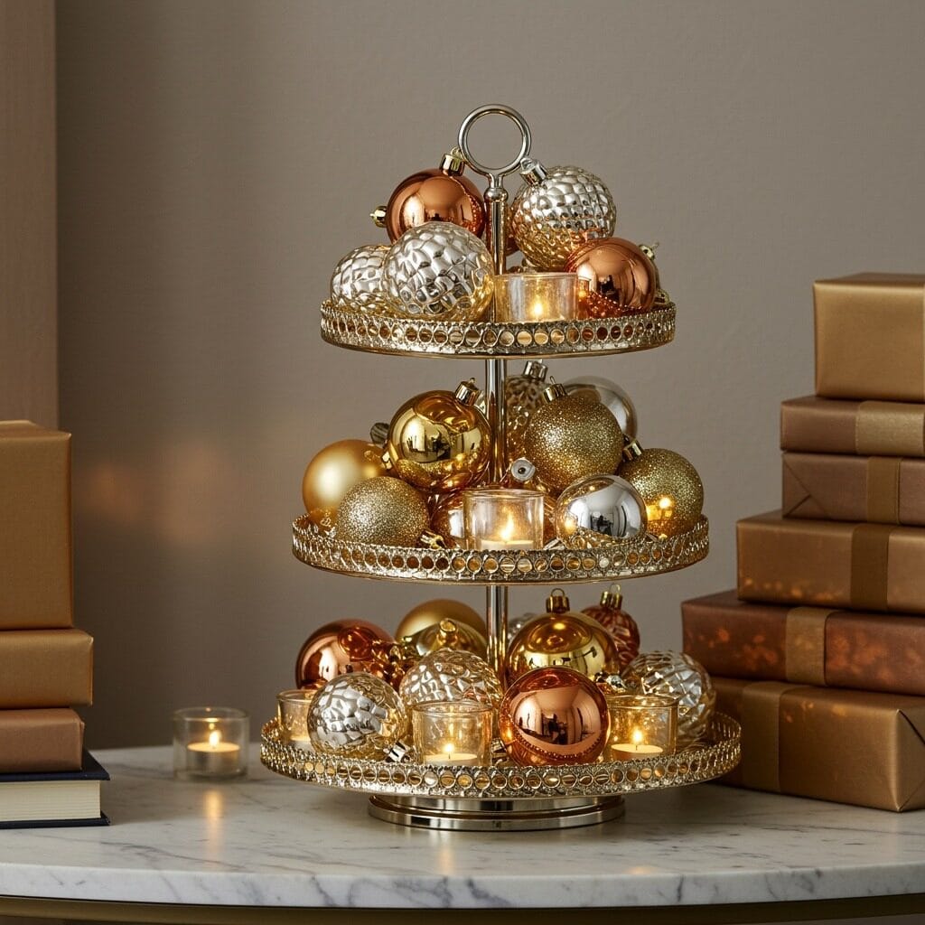 Create height and drama with a three-tiered cake stand displaying ornaments like precious gems. Choose ornaments in a cohesive color palette – perhaps all metallics or varying shades of blue. Mix textures and sizes, placing larger ornaments on bottom tiers and delicate pieces on top.