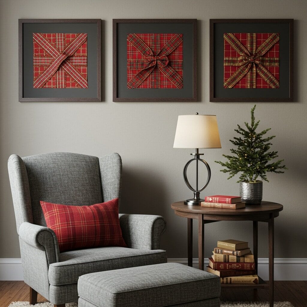 Transform inexpensive plaid ribbon into sophisticated wall art that rivals expensive holiday prints. Choose three coordinating plaid patterns in similar color families, then mount them on canvas or within matching frames. Vary the ribbon widths and create clean, geometric patterns.