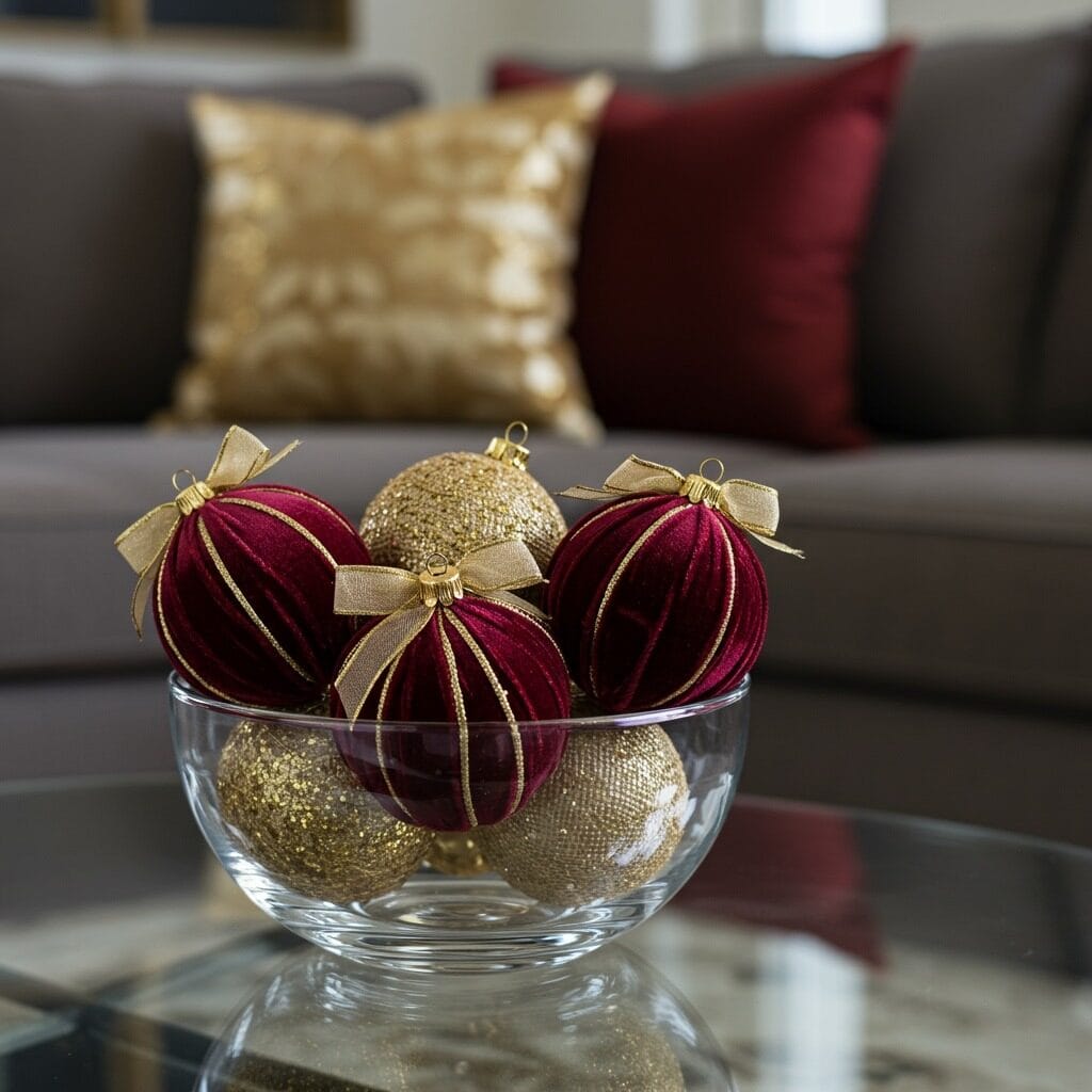 Wrap foam balls in luxury fabrics like velvet, burlap, and metallic brocade to create custom ornaments that look incredibly expensive. Choose fabrics in a cohesive color story, then cluster them in glass bowls or hang them at varying heights from decorative branches.