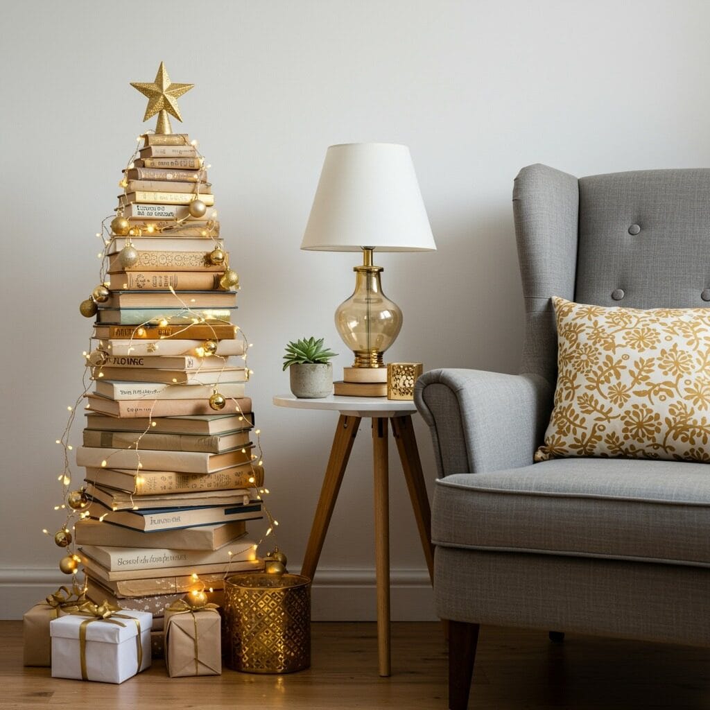 Stack vintage books in decreasing sizes to create an unconventional Christmas tree that book lovers will adore. Choose books with similar spine colors or wrap them in coordinating papers. Top with a simple gold star and weave battery lights between the layers.