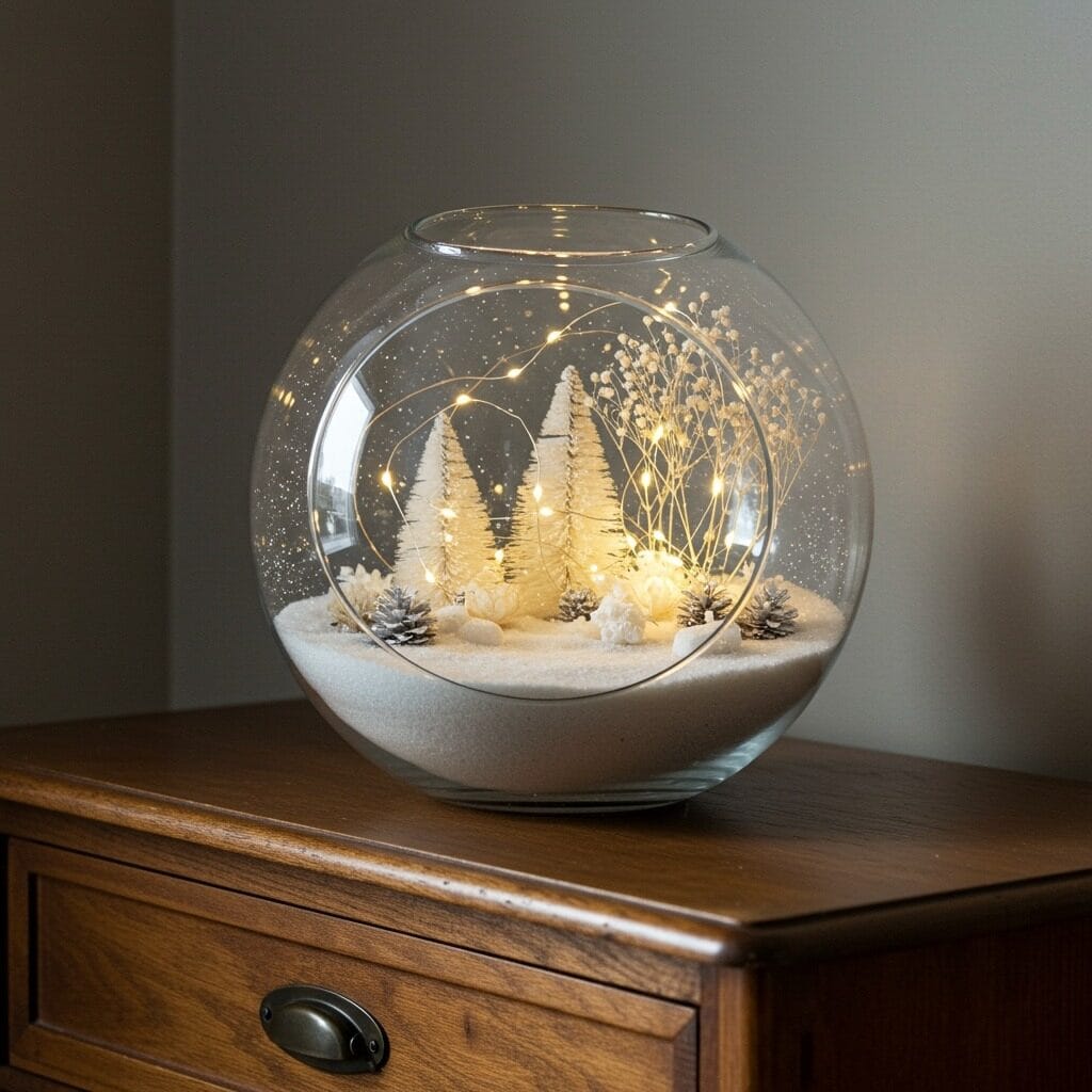 Build a winter landscape inside a large glass terrarium using white sand, preserved white flowers, and small decorative trees. Add battery-operated micro lights for subtle illumination. The enclosed environment creates a snow globe effect that’s mesmerizing to watch.