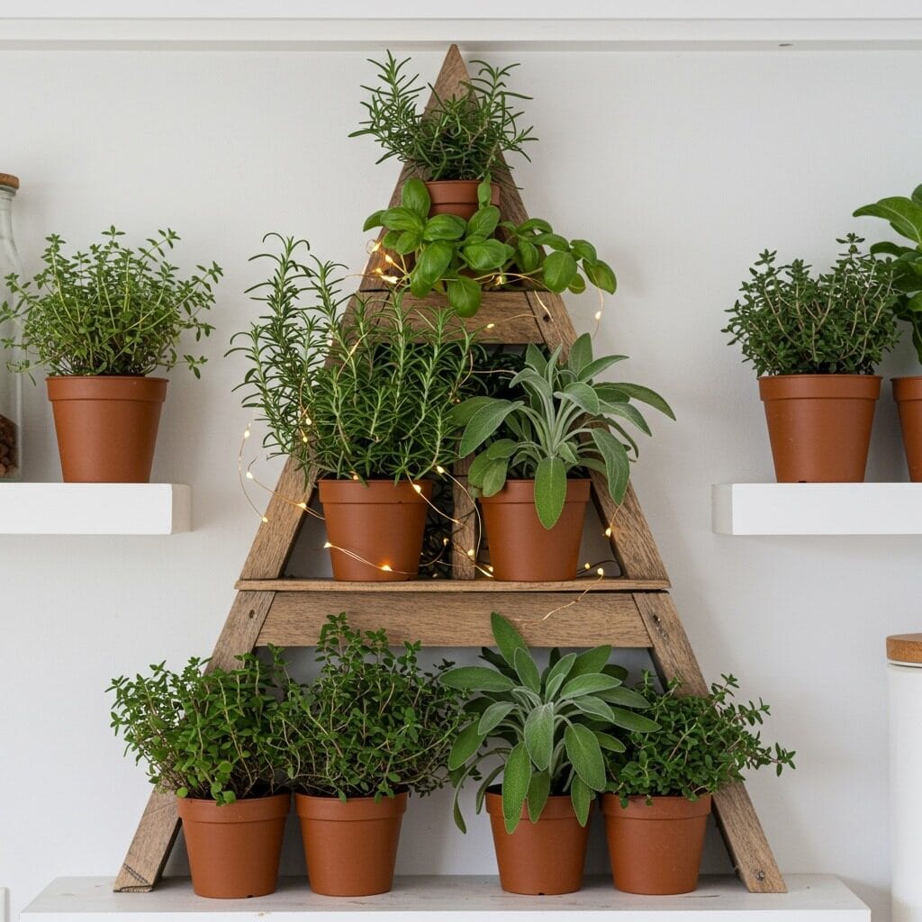 Repurpose your kitchen herbs into a fragrant Christmas display. Arrange potted herbs like rosemary (naturally tree-shaped), thyme, and sage in a triangular formation on open kitchen shelves. Wrap small warm lights around the rosemary for a glowing effect.