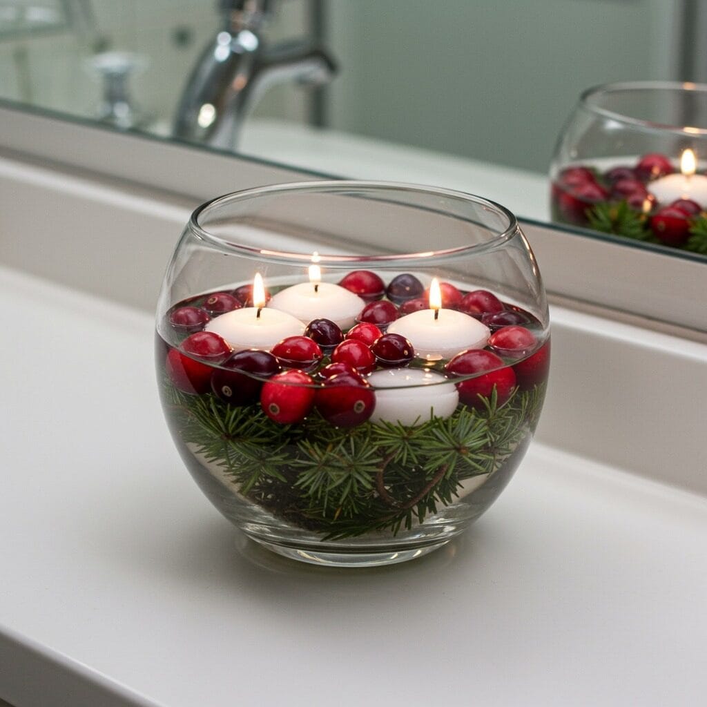 Transform glass bowls into floating winter gardens using white candles, cranberries, and evergreen sprigs. The cranberries add pops of color while creating a bed for floating candles. Submerge small evergreen branches for natural beauty that won’t interfere with the flame.