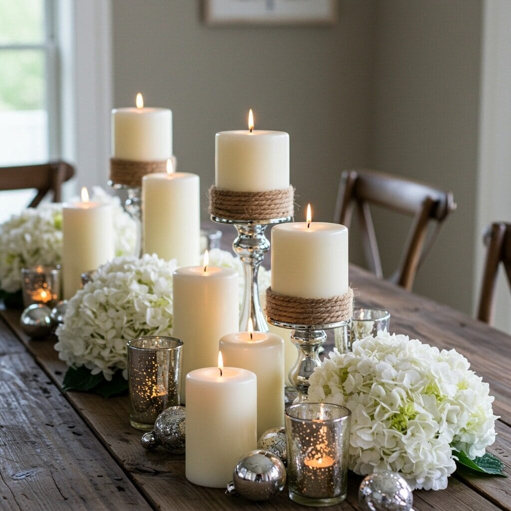 Design a stunning centerpiece using candles of different heights and textures. Start with pillar candles in white, cream, and soft gray, then add texture with rope-wrapped votive holders and mercury glass accents. The professional secret is creating odd-numbered groupings and varying heights by at least four inches between each level.