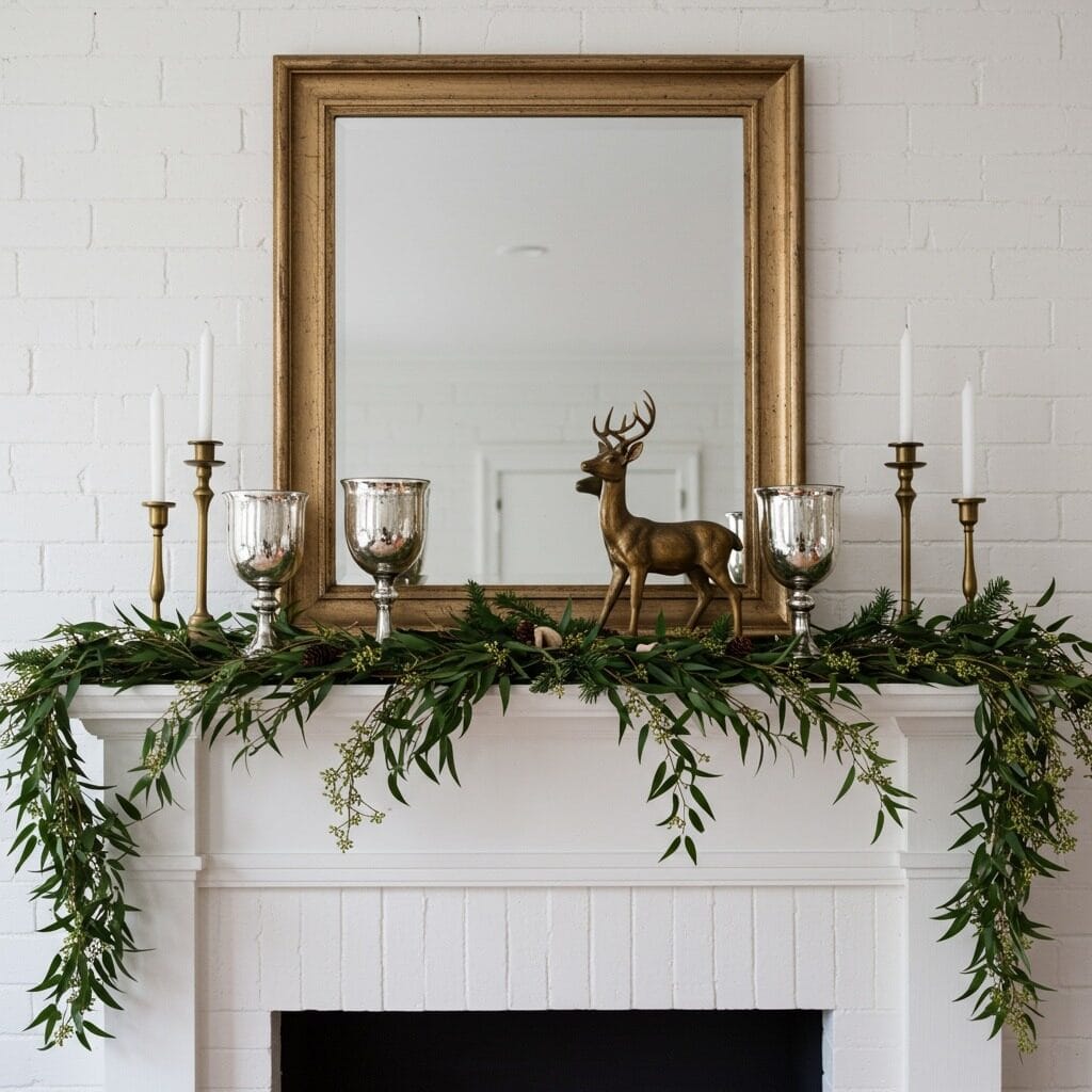 Create depth and luxury on your mantel using the designer trick of layering in odd numbers. Start with a large mirror or artwork as your anchor, then layer in greenery at varying heights. Add pillar candles in mercury glass holders, small framed photos, and one statement piece like a vintage brass deer.