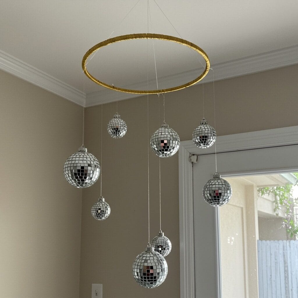 Suspend mirrored ornaments at varying heights from a wooden embroidery hoop wrapped in metallic ribbon. Choose ornaments in different sizes but similar finishes – all silver or all gold works best. The movement and light reflection create mesmerizing visual interest.