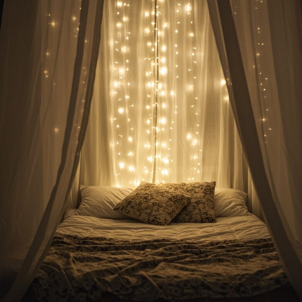 Create a magical backdrop behind your bed using sheer curtains embedded with fairy lights. Hang white or cream sheer panels, then weave warm white LED strings through the fabric in organic patterns. The layered lighting creates depth and romance.
