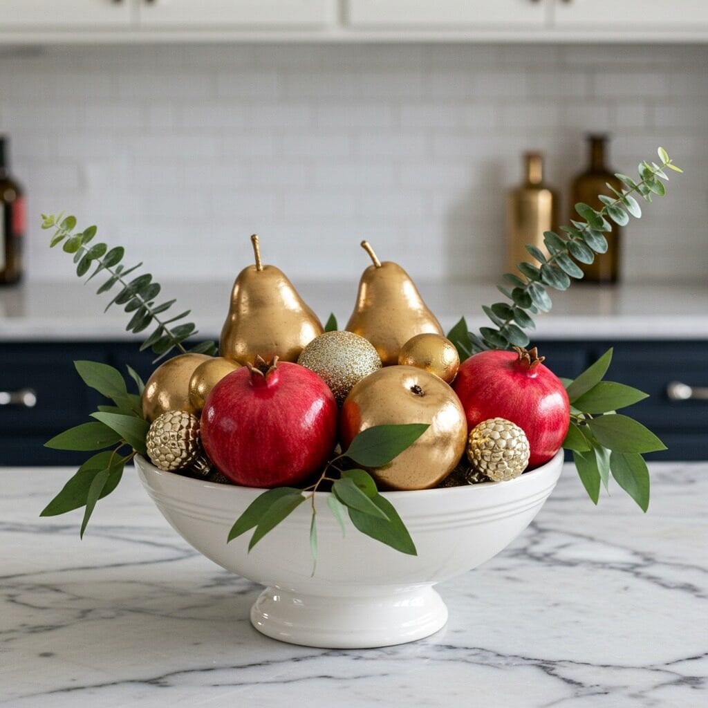 Arrange in a wide, shallow bowl with eucalyptus sprigs and a few metallic ornaments. The combination of natural and artificial elements creates richness, while the edible components keep it grounded and practical. This works perfectly for kitchen counter decorating during the holidays.