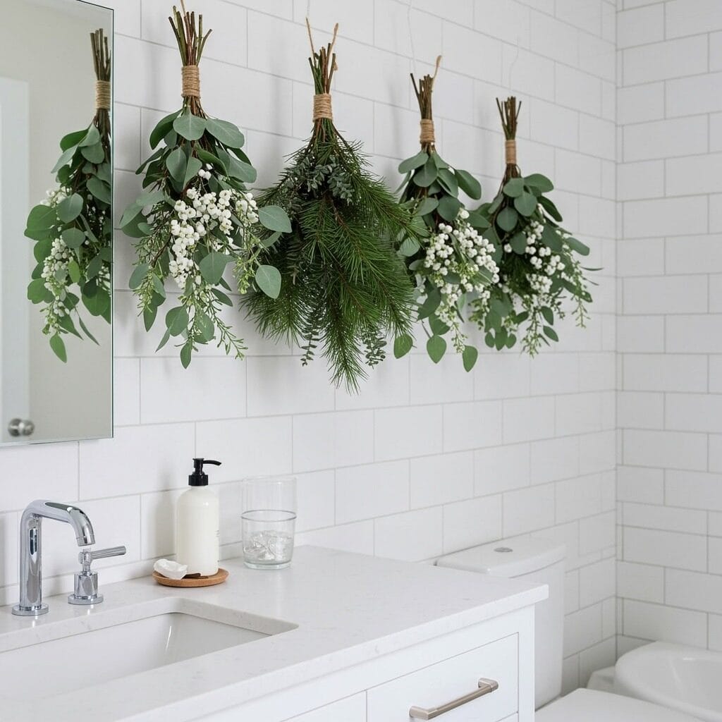 Hang them from bathroom vanity lighting or place in tall glass vases on counters. The natural scents create a spa-like atmosphere while the structured arrangement maintains the polished aesthetic you’ve worked hard to achieve in your modern farmhouse bathroom.