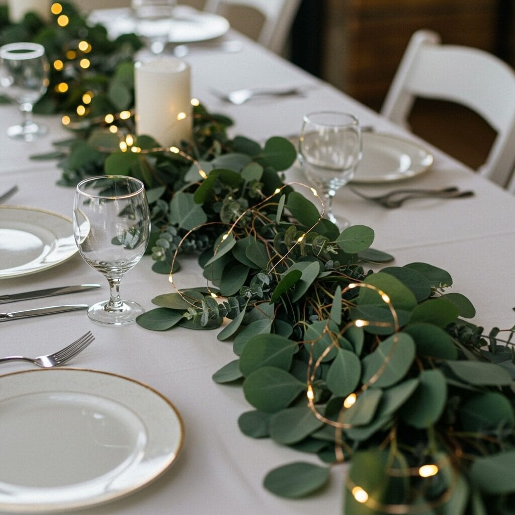 Combine industrial and natural elements for a surprisingly sophisticated table runner. Weave copper wire through fresh eucalyptus garland, creating organic spirals that catch light beautifully. Add small battery-operated fairy lights woven throughout for subtle illumination.