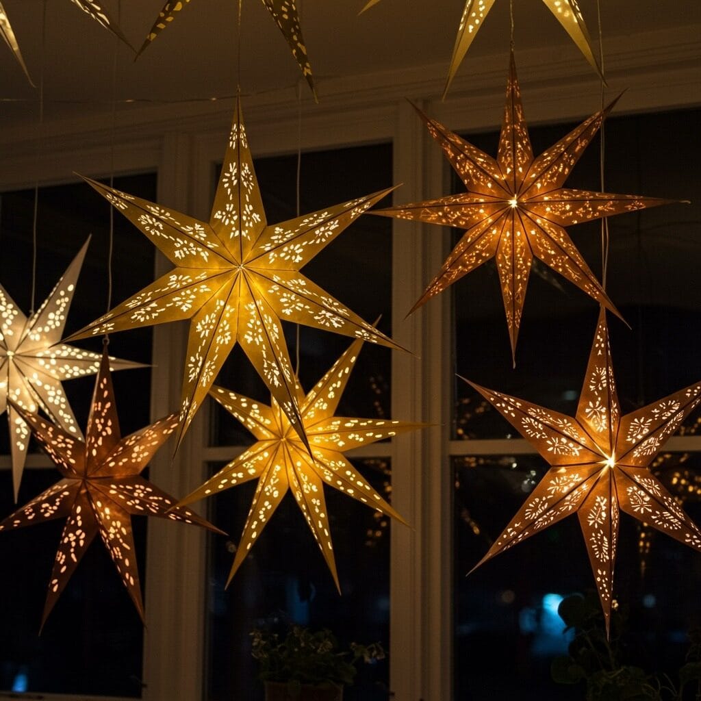 Create dramatic lighting with large paper star lanterns in metallic finishes. Cut precise star shapes from heavy cardstock in gold, silver, or copper, then score and fold to create dimensional forms. Add battery-operated LED strings inside for a warm glow.