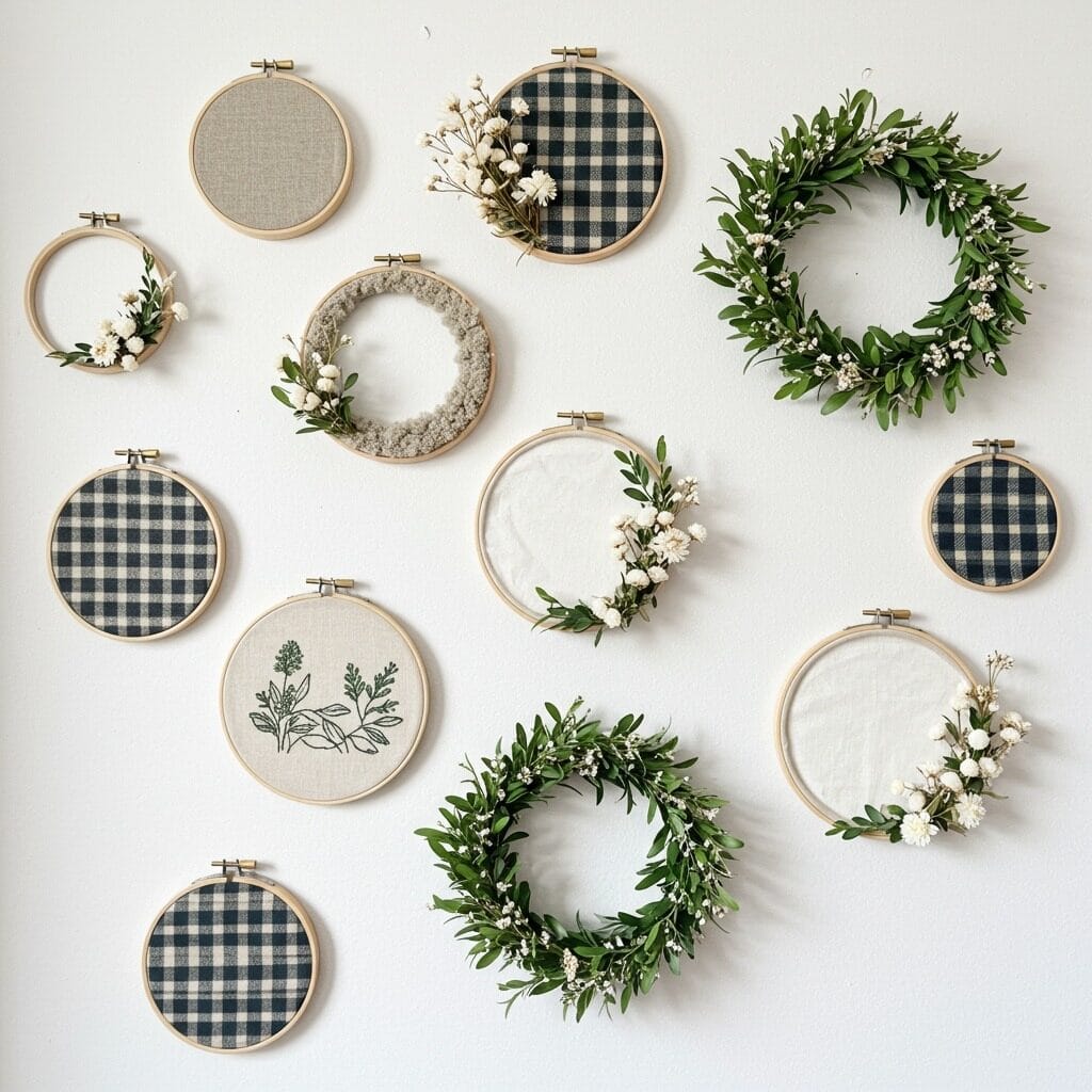 Create a gallery wall of wreaths using embroidery hoops in different sizes. Wrap each hoop in coordinating ribbons, then fill with different materials – some with greenery, others with fabric, and some with decorative paper or dried flowers.