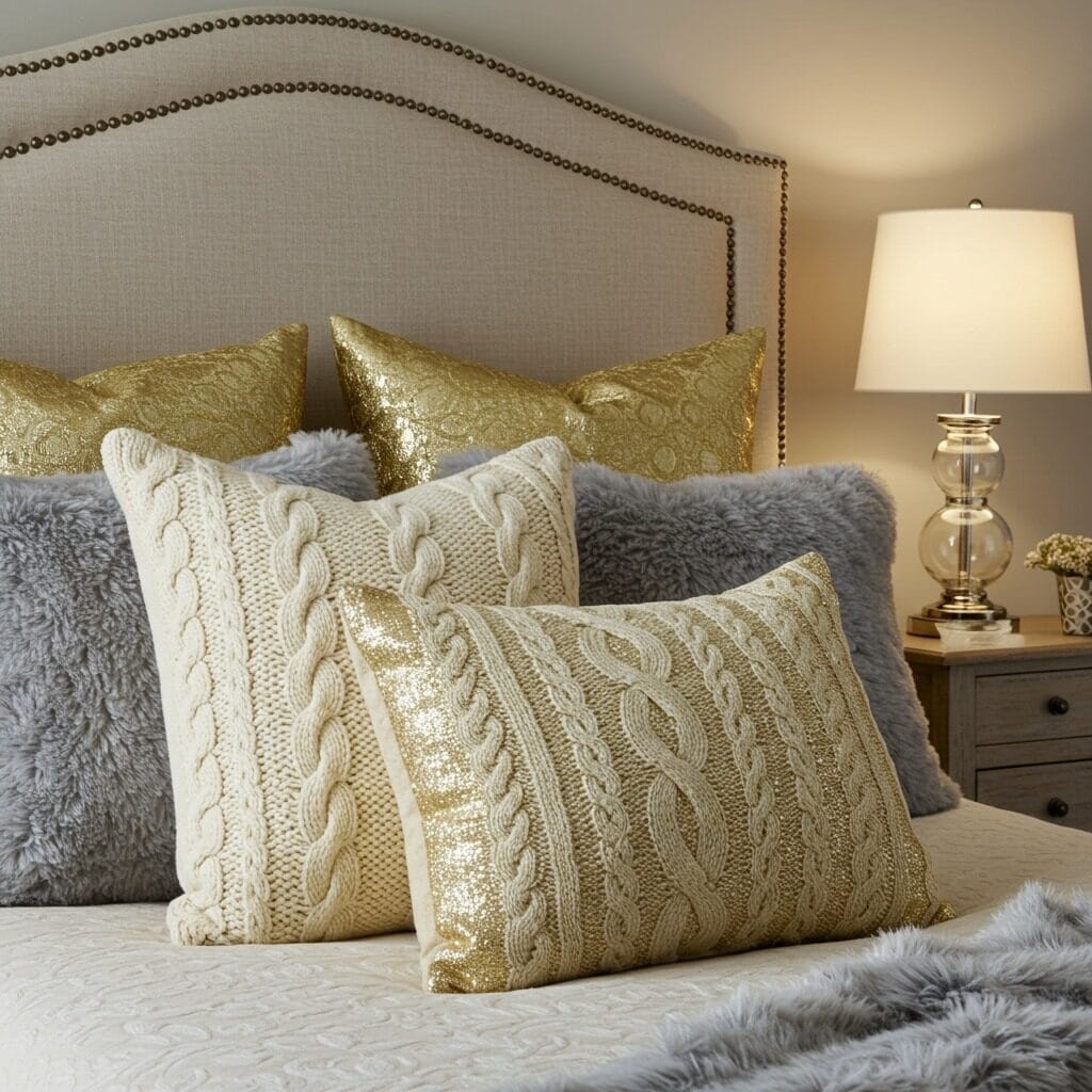 Transform ordinary throw pillows into luxury holiday accents using textured fabrics. Combine cable-knit sweater material, faux fur, and metallic brocade in coordinating winter colors. The mix of textures creates visual richness that feels expensive and carefully curated.