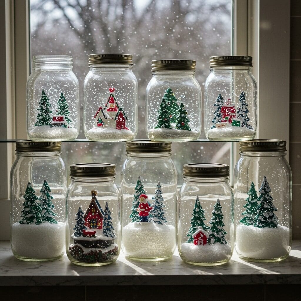 Create a collection of mason jar snow globes using different winter scenes in each jar. Fill with white glitter “snow,” small figurines, and miniature trees. Add glycerin to water for slower-falling snow effect, then seal with waterproof adhesive.