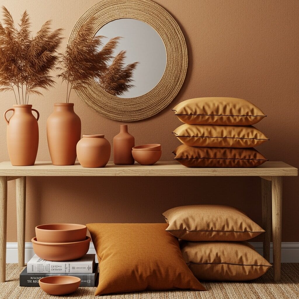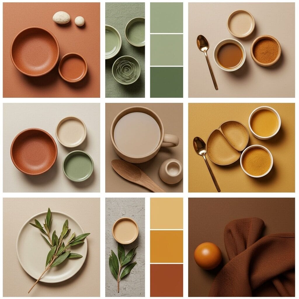 The best part about working with this palette? It’s nearly impossible to make a mistake. These colors are naturally complementary, which means you can mix and match with confidence. A sage green throw pillow will look stunning on a terracotta sofa, and warm ochre walls will beautifully frame deep brown furniture.