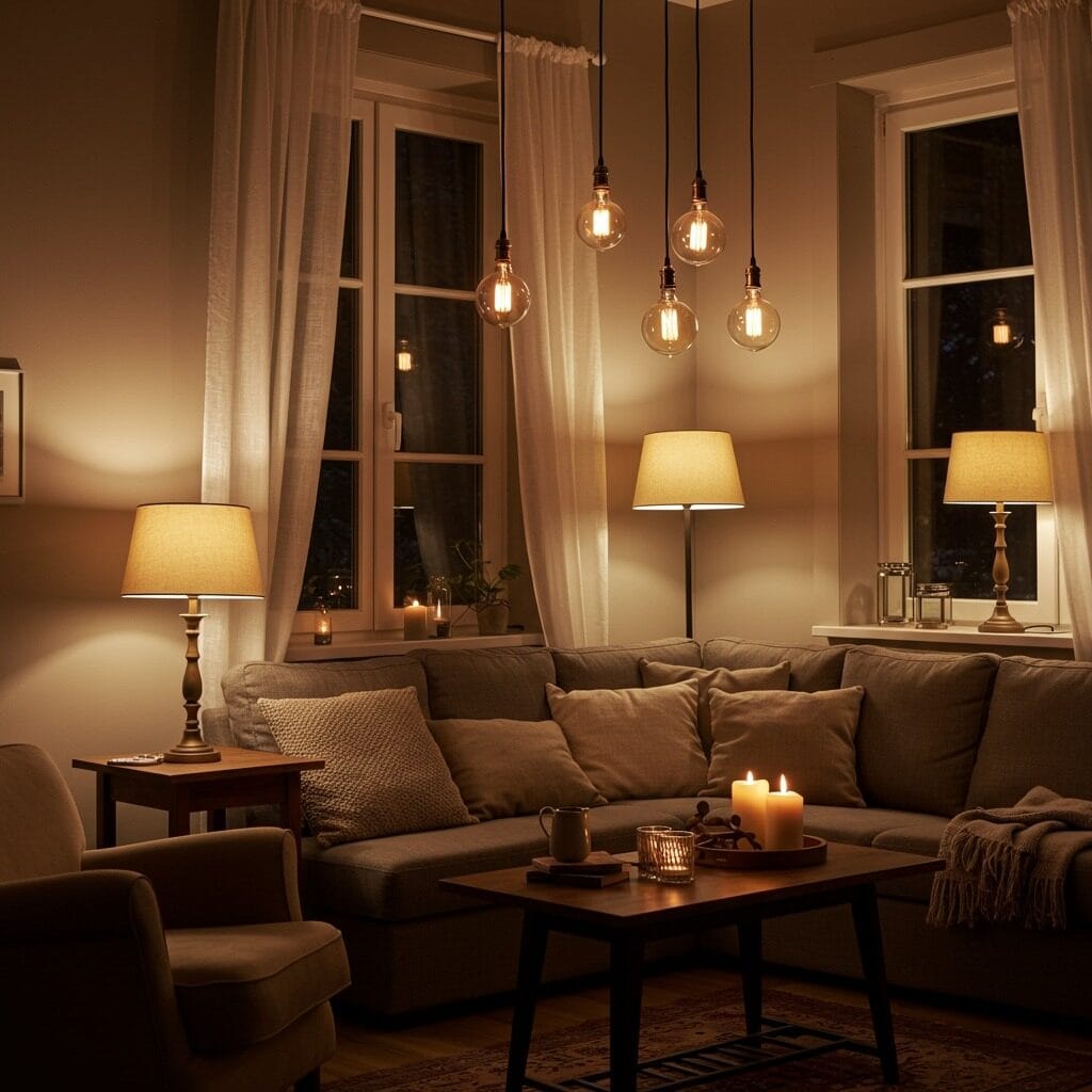 Lighting can transform your earthy living room from ordinary to absolutely magical. The goal is to create multiple layers of warm, soft light that make your space feel intimate and welcoming, especially as evening approaches.