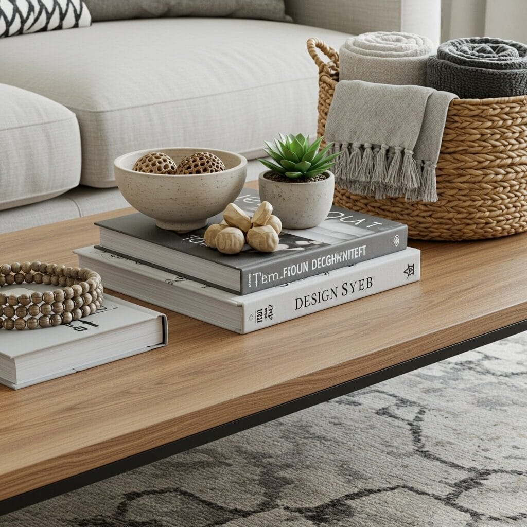 Mix different furniture heights and shapes to create visual interest. A low, sturdy coffee table styling piece paired with a tall, narrow bookshelf adds dimension without feeling cluttered. Remember, each piece should feel substantial and well-made – quality over quantity is key in creating that grounded, earthy atmosphere.