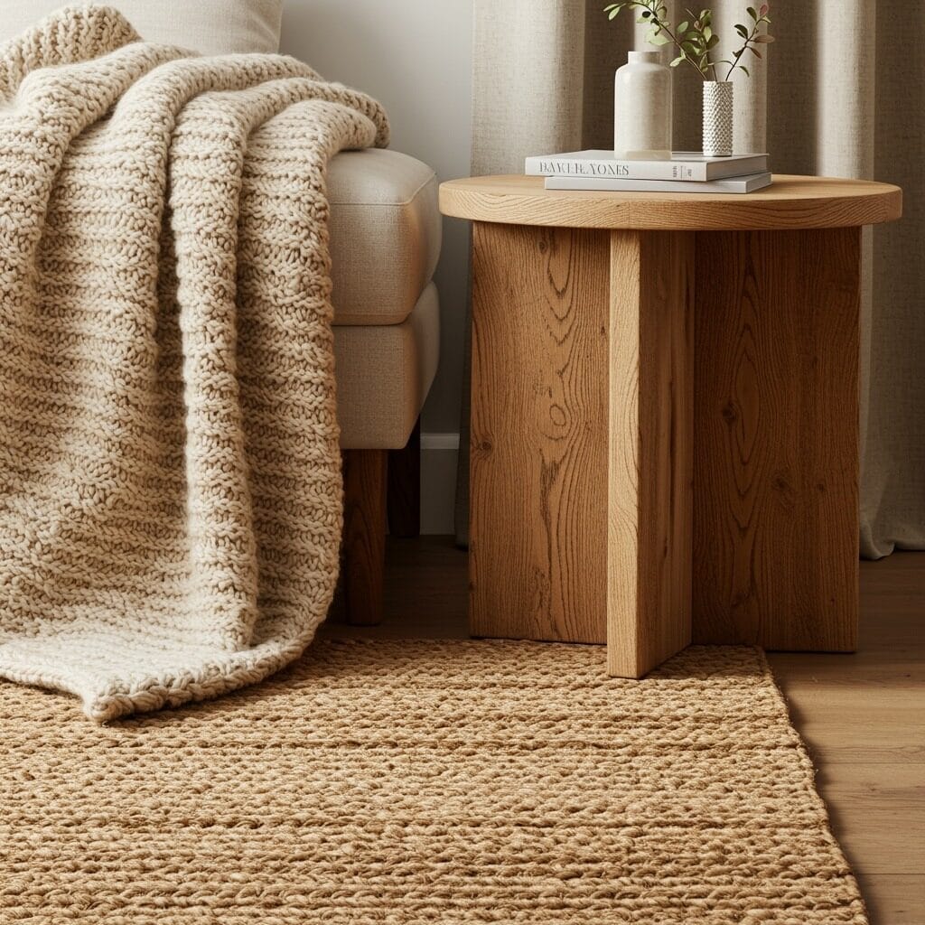 A chunky jute rug underfoot immediately grounds your seating area while adding that organic, handcrafted feel. Linen curtains in warm cream or soft sage filter light beautifully and bring movement to your windows. These textures don’t just look good – they feel amazing too.