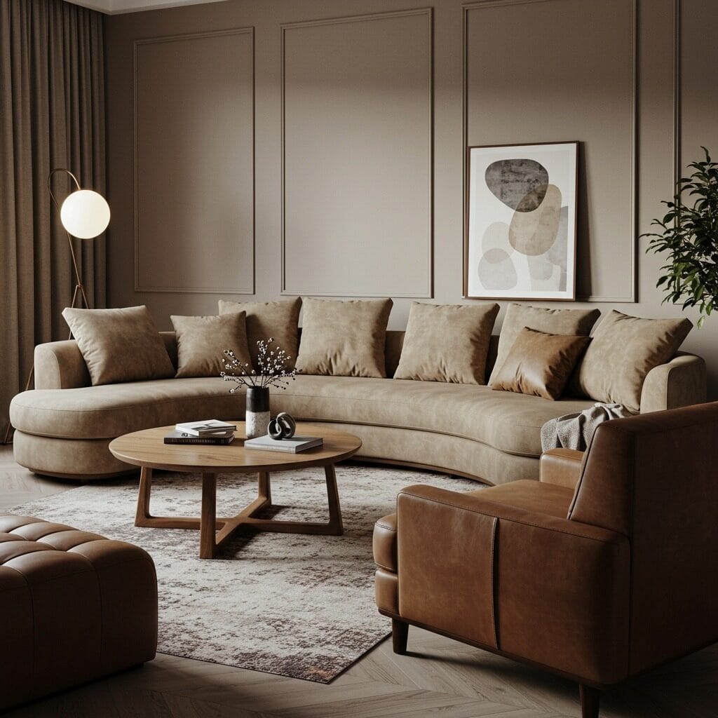 The right furniture can make or break your earthy living room vision. Look for pieces with organic shapes and natural materials that echo the relaxed vibe you’re creating. Curved sofas feel more approachable than sharp, angular pieces, while round coffee tables encourage better conversation flow.