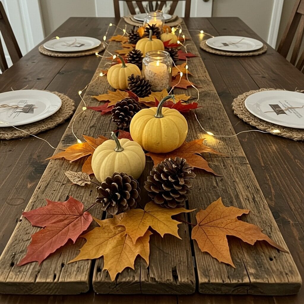 Layer your wooden runner with scattered autumn leaves, mini pumpkins, and pine cones for texture. The key is to make it look naturally arranged – like you just gathered these treasures from a walk through the woods. Add battery-operated string lights weaved between the elements for a soft, magical glow.