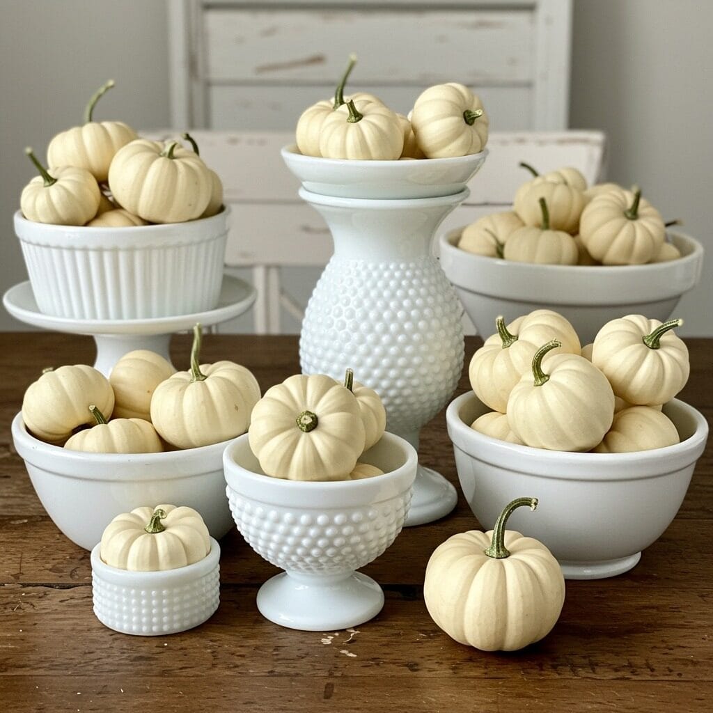 Milk glass pieces are farmhouse treasures, and when you fill vintage milk glass bowls, vases, or compotes with small white and cream pumpkins, you create displays that feel both elegant and rustic. The combination of the creamy glass and natural pumpkin textures is simply perfect.