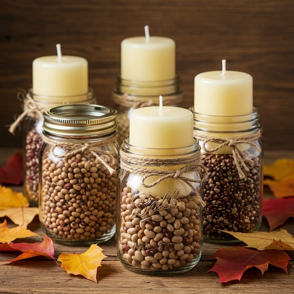 Transform ordinary mason jars into charming candle holders that perfectly capture the farmhouse aesthetic. Fill clear mason jars with dried beans, lentils, or small river rocks before nestling pillar candles inside – this creates both stability and visual interest.