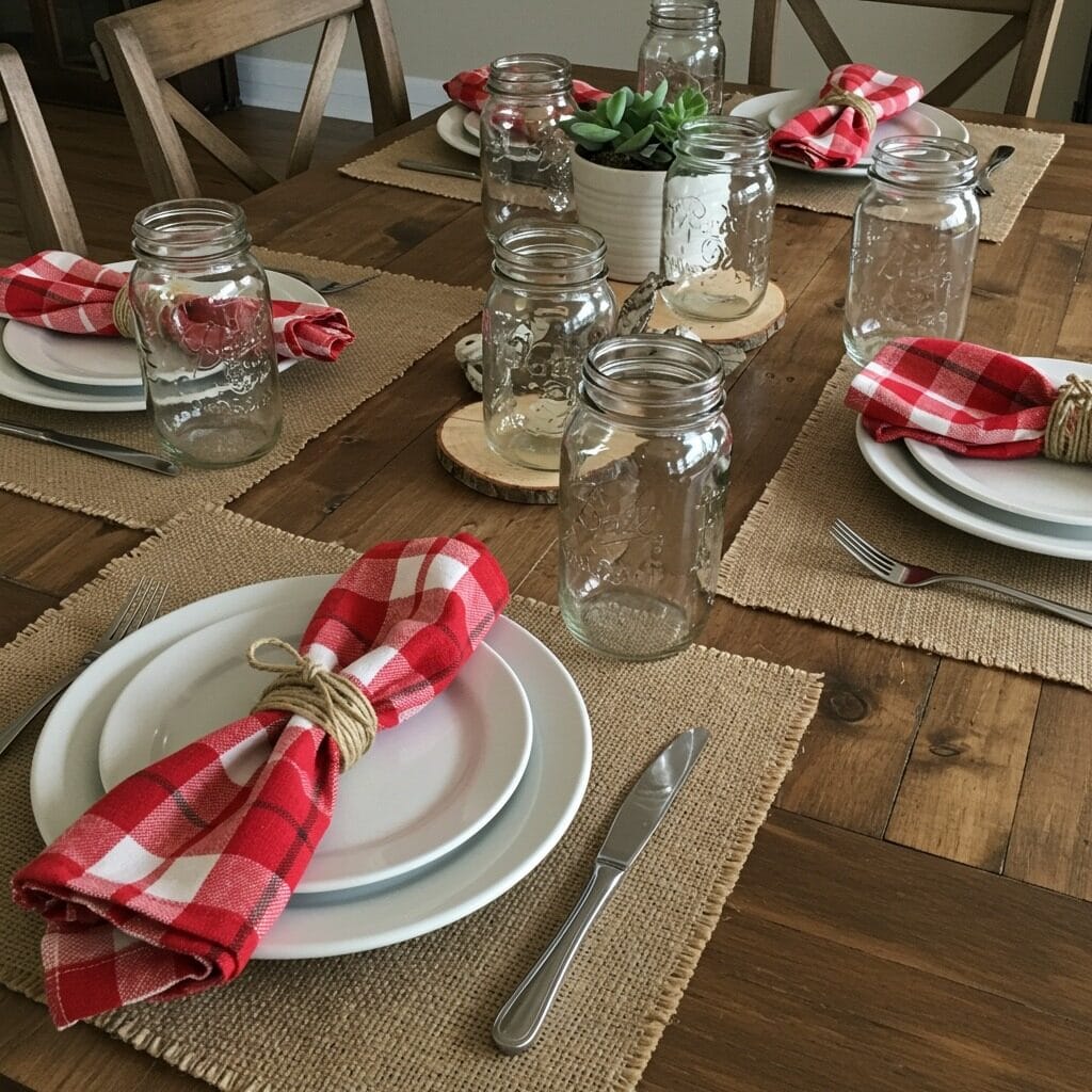 Create place settings that feel like they belong in a cozy farmhouse by layering textures and patterns thoughtfully. Start with burlap placemats or table runners as your foundation – they’re affordable and instantly add rustic texture to any dining table centerpiece arrangement.