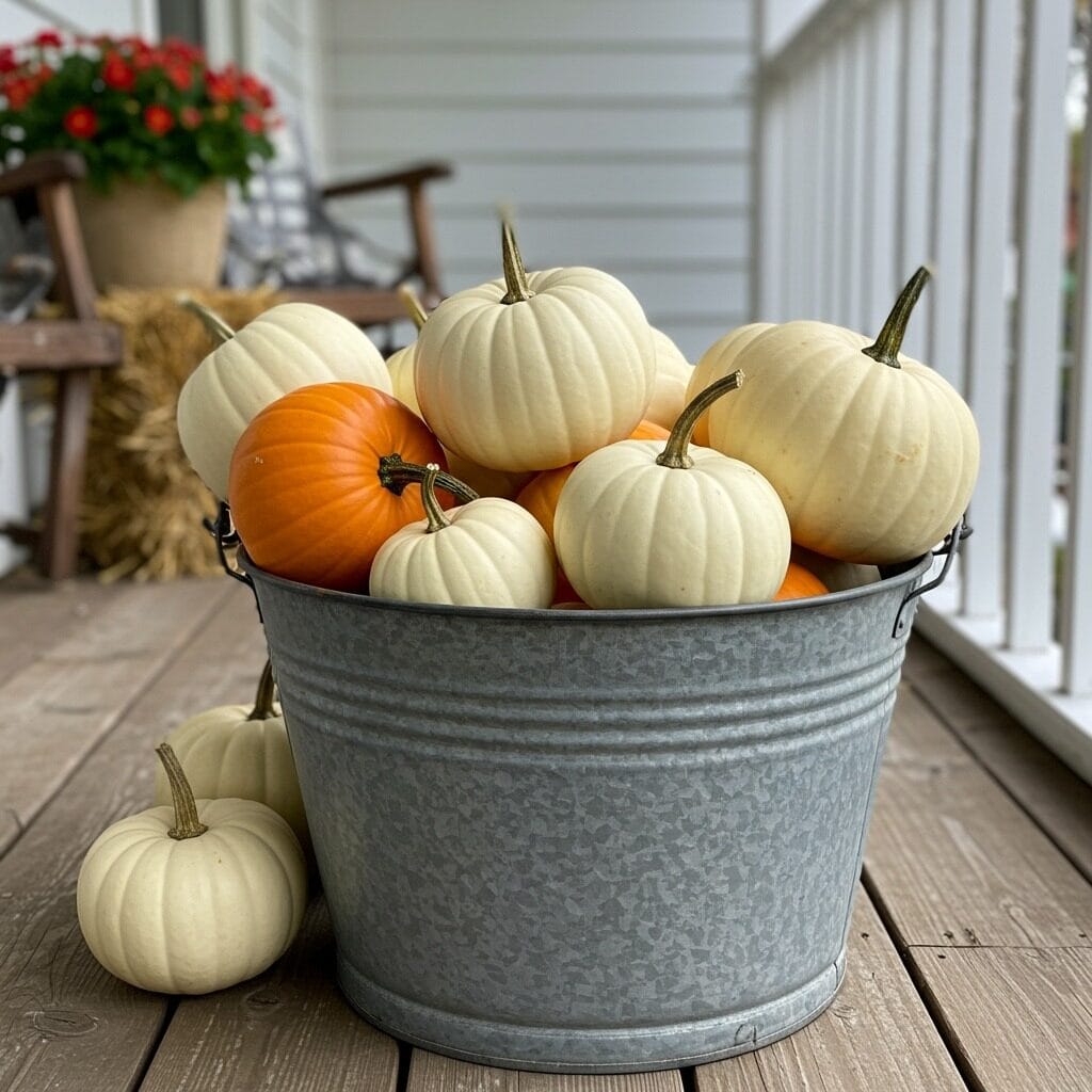 Galvanized metal containers are a farmhouse staple, and they make perfect vessels for creating stunning pumpkin displays. Use old galvanized buckets, watering cans, or even chicken feeders to showcase a variety of pumpkins and gourds in different sizes and colors.