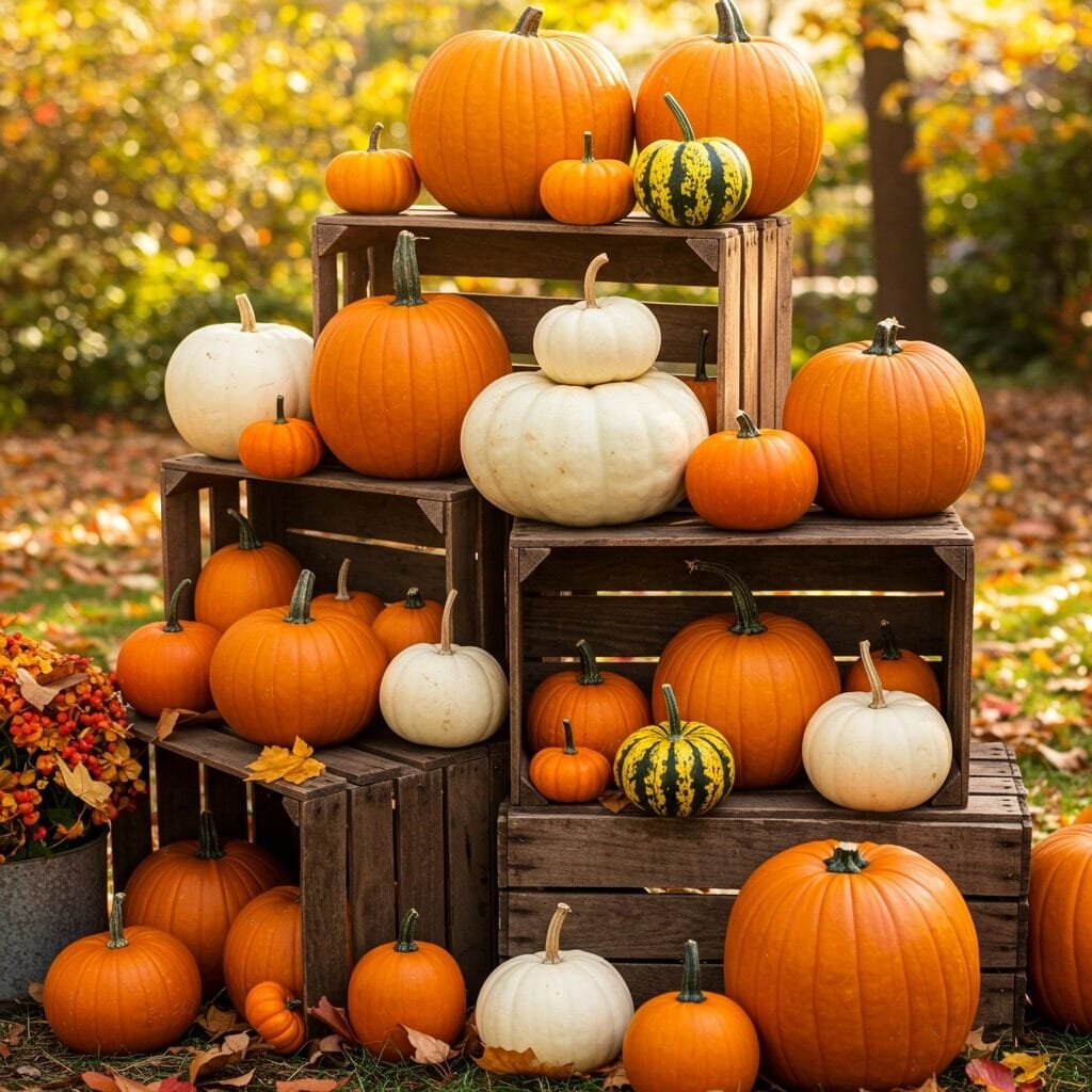 Start with pumpkins of different sizes – mini ones, medium classics, and a few statement giants. Mix in white pumpkins and those gorgeous blue-green varieties for visual interest. I love using wooden crates or vintage baskets to create different levels, then filling in gaps with gourds, Indian corn, and colorful autumn leaves.