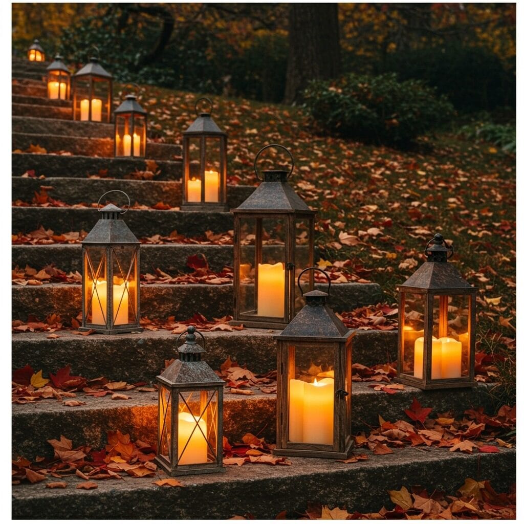 Battery-operated LED candles are your best friend here – they give you that authentic flicker without any fire hazard. Place lanterns at different heights along your steps, hang them from shepherd’s hooks, or group them asymmetrically by your door. The uneven placement looks more natural and inviting.