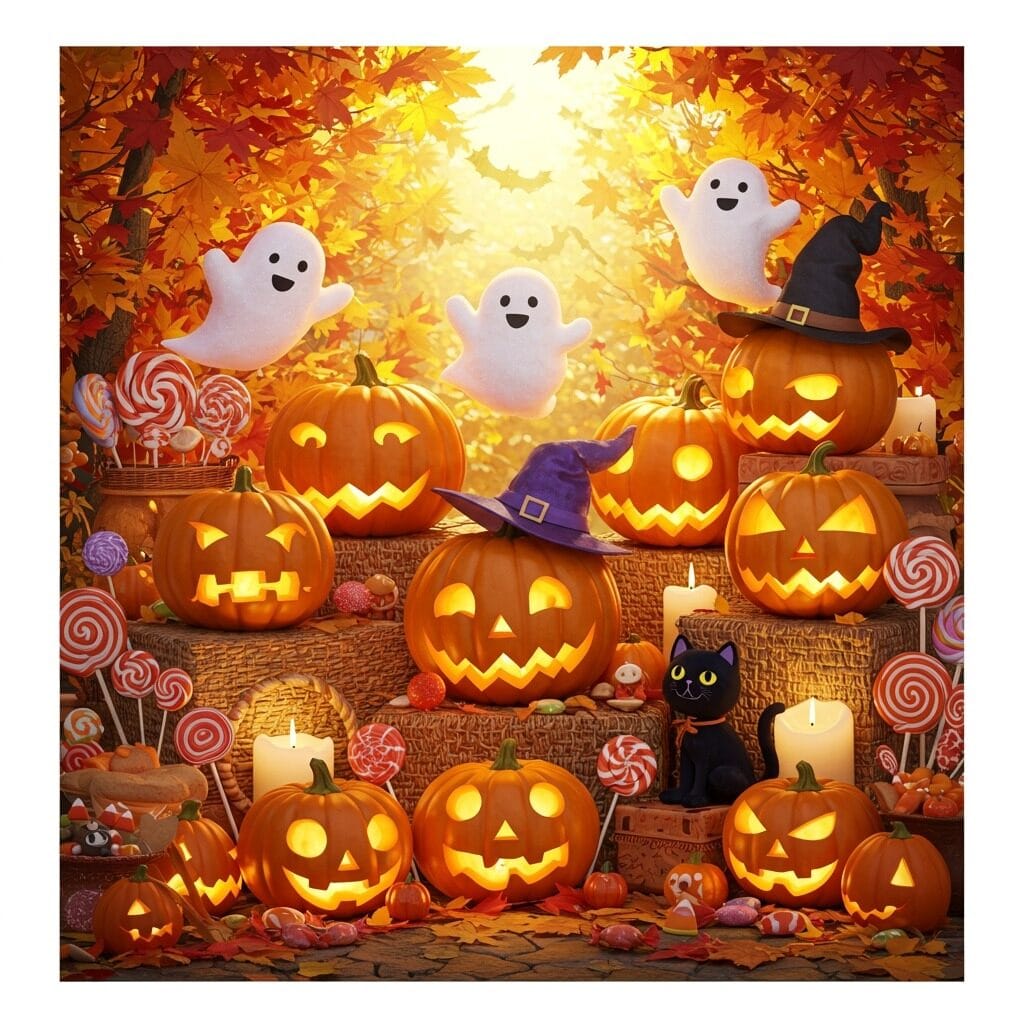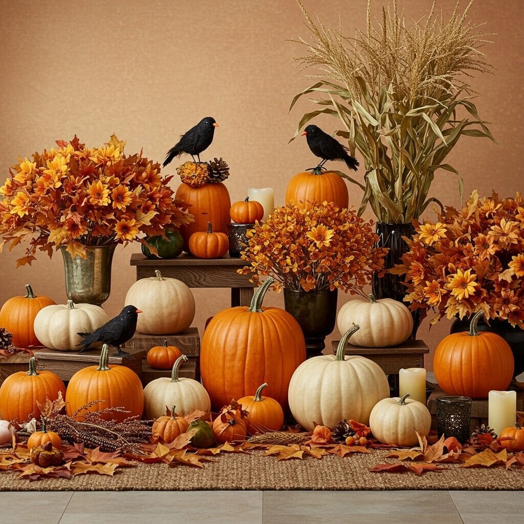 Start with classic harvest elements – corn stalks, hay bales, and abundant pumpkins. Then layer in Halloween touches like carved mini pumpkins, black crows nestled among the corn, or autumn leaf garland with small plastic bats hidden throughout.