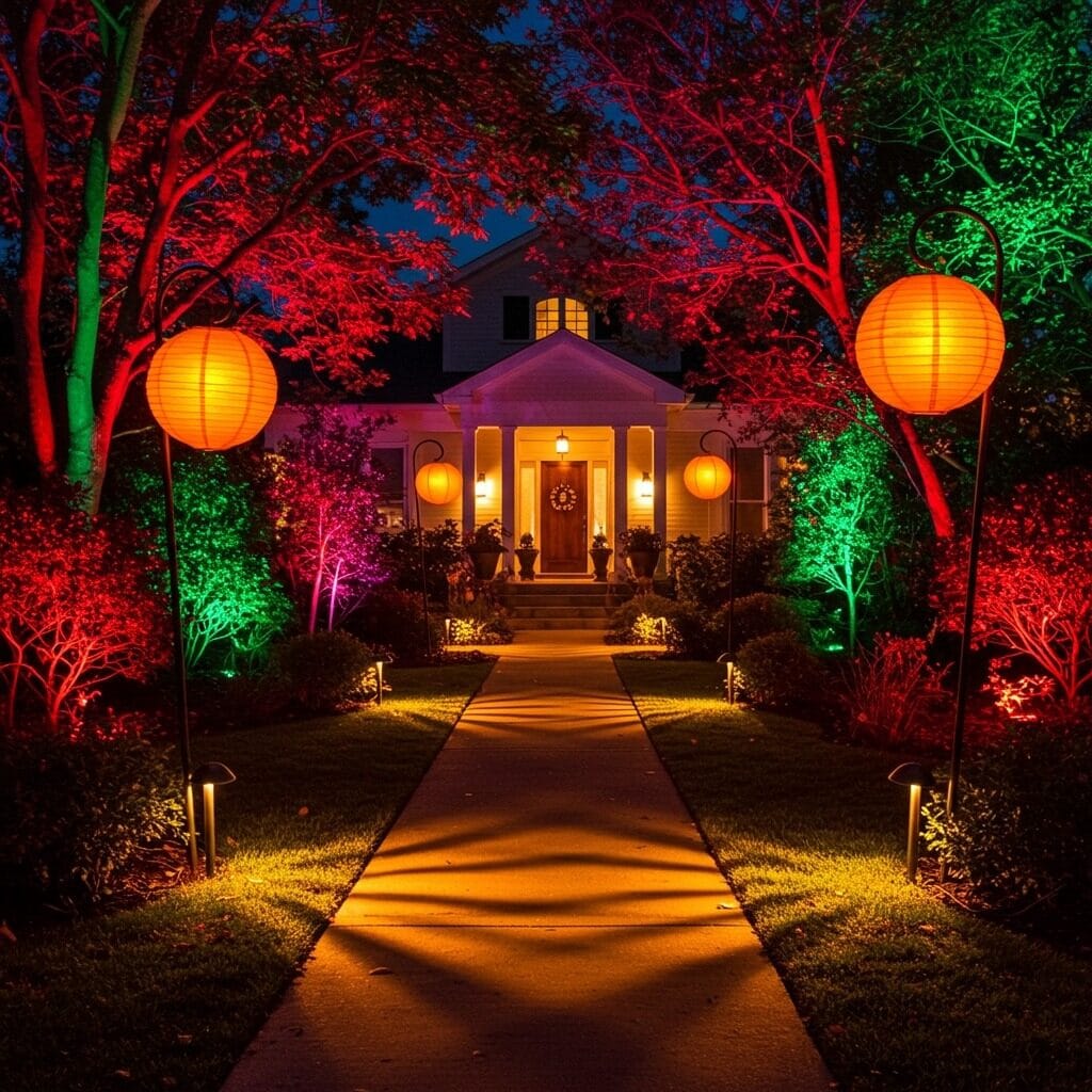 Colored LED spotlights can wash your front door or porch columns in eerie green, deep purple, or blood orange light. Solar pathway lights guide trick-or-treaters safely while adding to the ambiance. Uplighting on trees or large plants creates dramatic shadows that change throughout the evening.