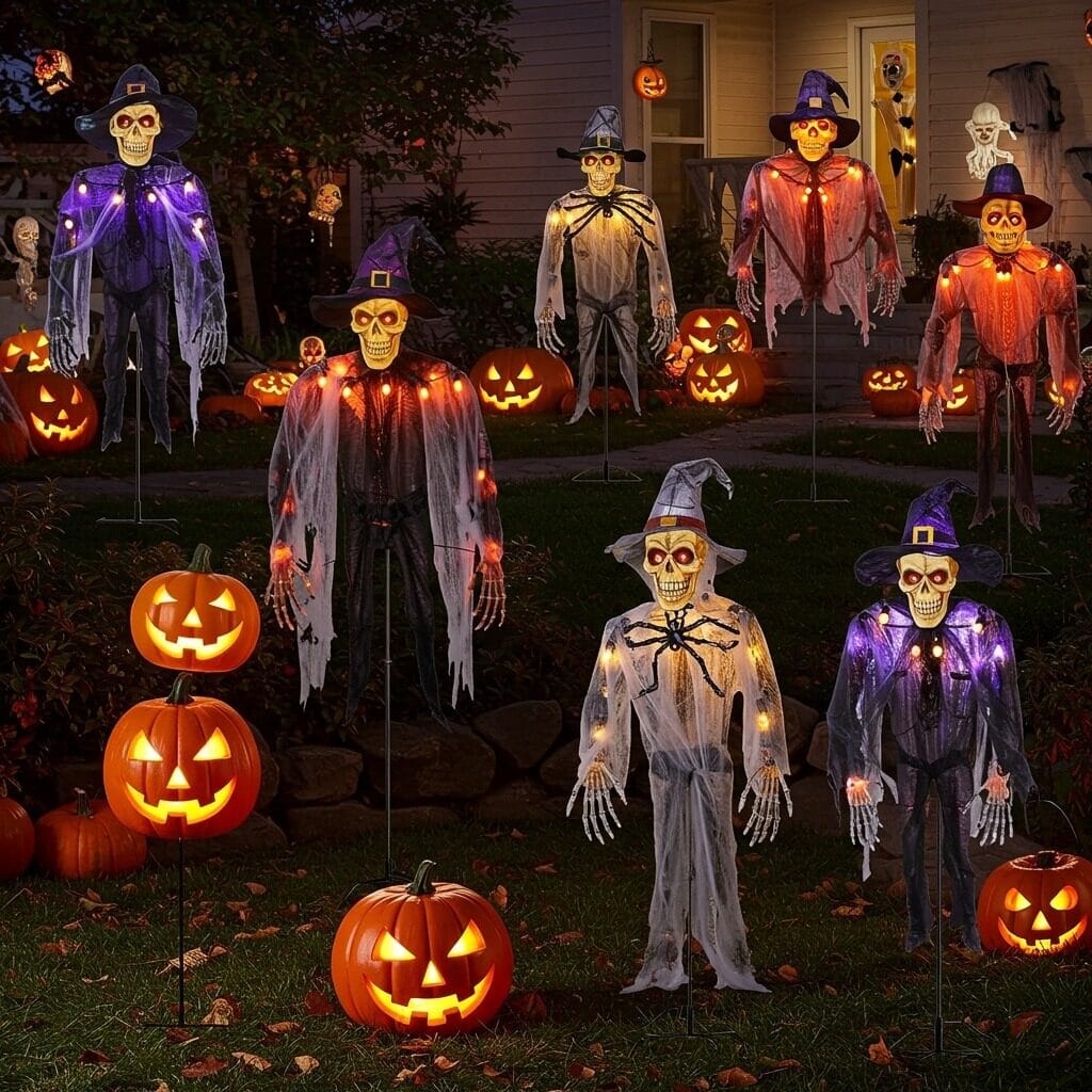 Invest in high-quality artificial pumpkins and gourds that won’t rot or attract pests. Secure lightweight decorations with fishing line or small weights to prevent wind damage. Choose LED lighting systems specifically designed for outdoor use with proper weather protection.
