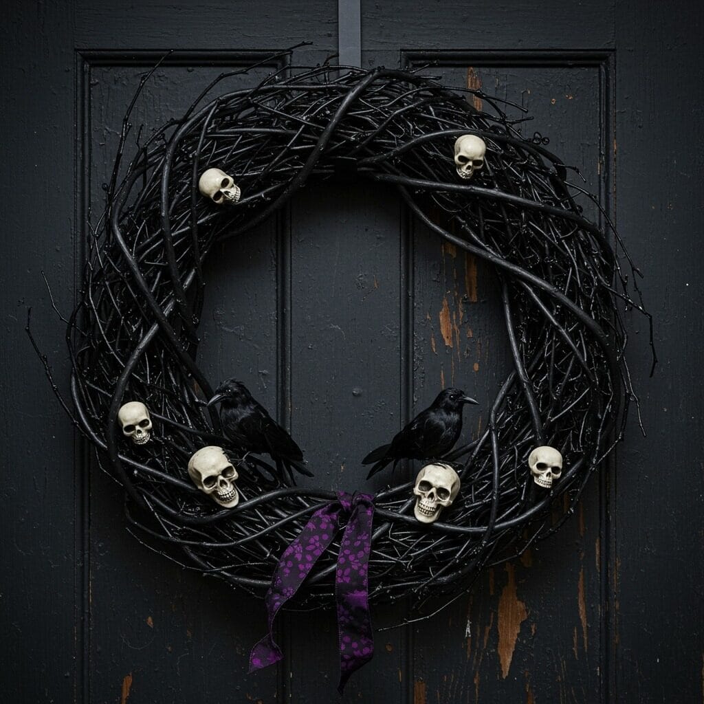 Don’t forget about incorporating natural elements like dried flowers or berries. Deep burgundy or black berries add richness without overwhelming the spooky aesthetic. A weathered burlap or velvet ribbon can tie everything together beautifully.