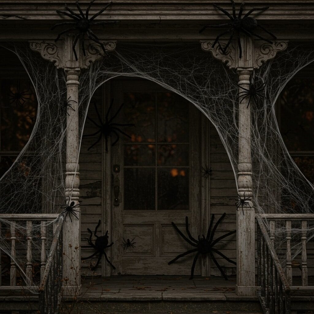 Start with high-quality fake spiders – the cheap plastic ones rarely look convincing. Position them where guests will notice but won’t accidentally walk into them. Door frames, porch columns, and window sills work perfectly for this.