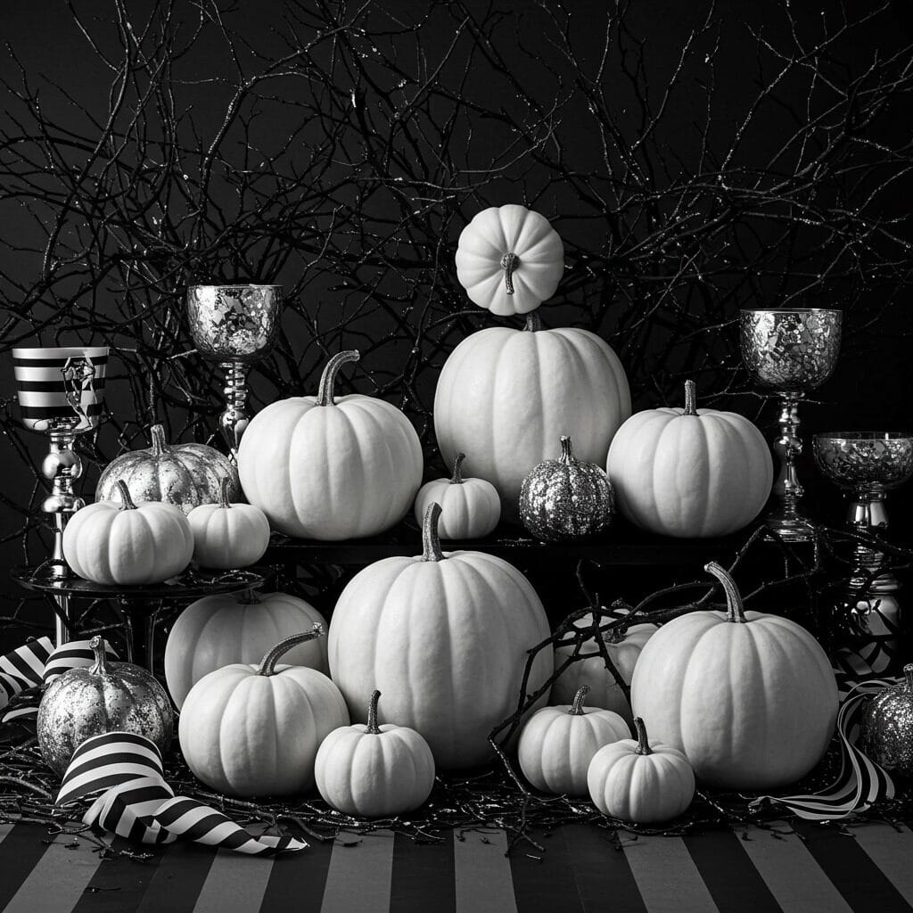 White pumpkins become the stars in this color scheme, especially when paired with black branches, silver accents, and maybe some black and white striped ribbons. The contrast is dramatic but refined.