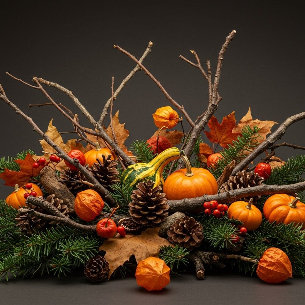 Collect interesting branches, colorful fallen leaves, and unique seed pods from your own yard or local parks. Arrange them with natural gourds and pumpkins for a display that feels like it grew organically from your landscape.