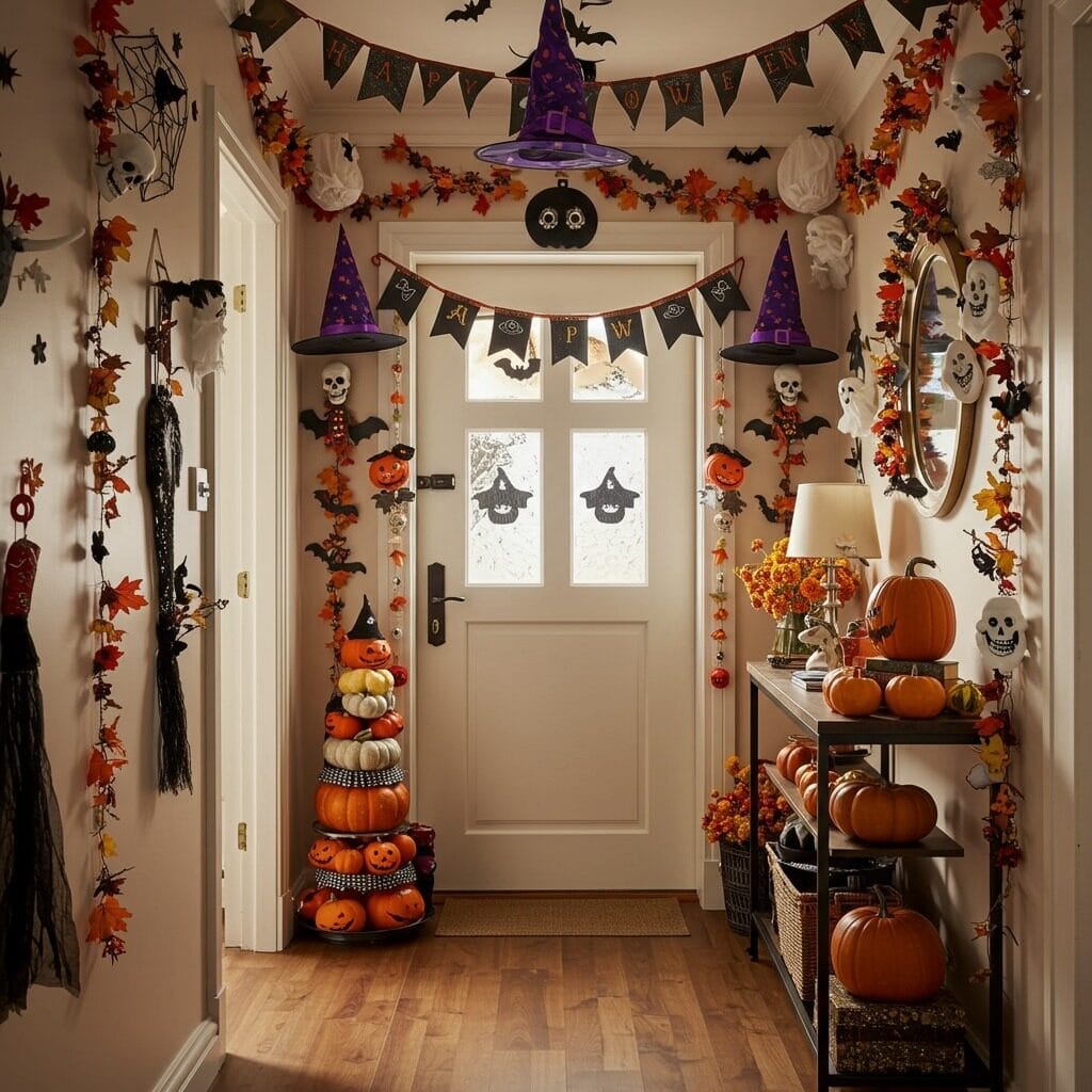 Even tiny entryways can make a big Halloween impact with smart decorating strategies. The key is choosing a focal point and building your design around vertical space and layered elements.