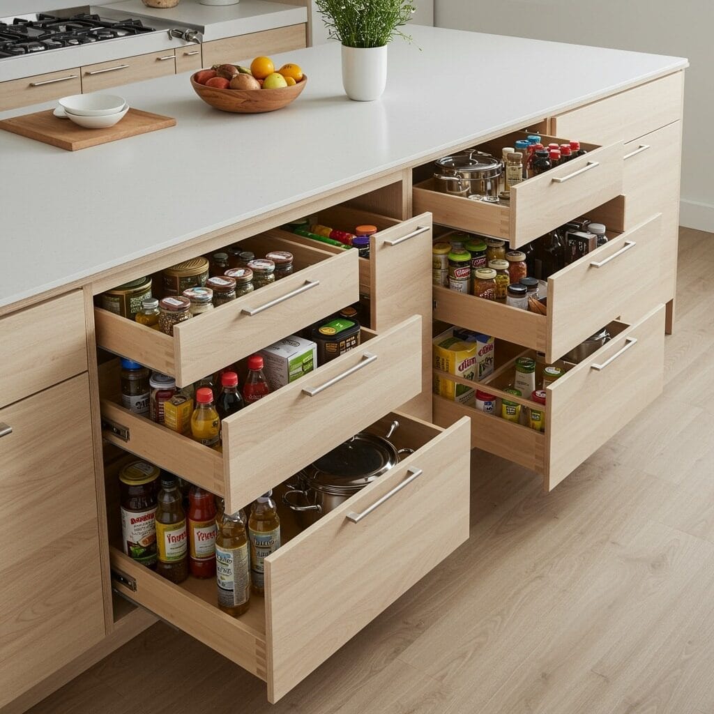 The secret is planning your storage zones based on how you actually cook. Keep frequently used items in the most accessible drawers, and use the island’s interior for bulk storage or rarely used appliances.