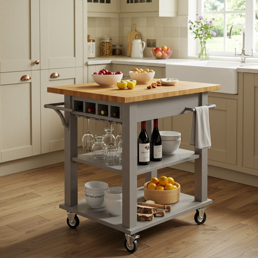 Not all islands need to be permanent fixtures. A mobile island on wheels gives you flexibility to reconfigure your kitchen layout whenever you need extra counter space or want to create better traffic flow.