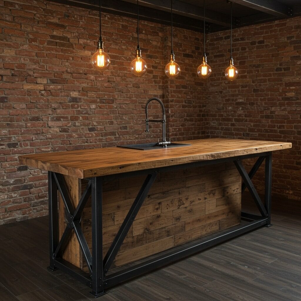 Embrace the industrial trend with a metal frame island that brings an edgy, loft-like vibe to your kitchen. Steel or iron frames paired with wood or concrete tops create striking contrast.