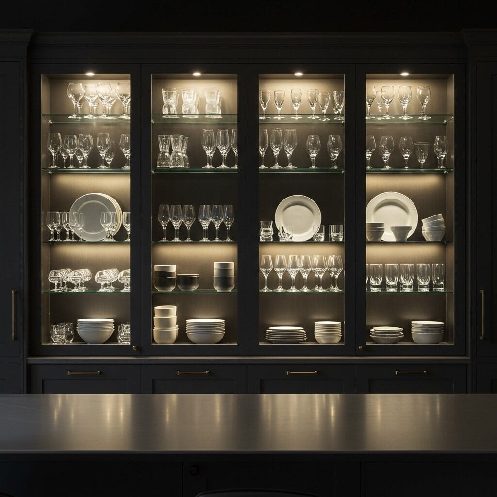 The key is keeping the displayed items curated and beautiful – think matching dish sets, pretty glassware, or leather-bound cookbooks rather than random kitchen clutter.