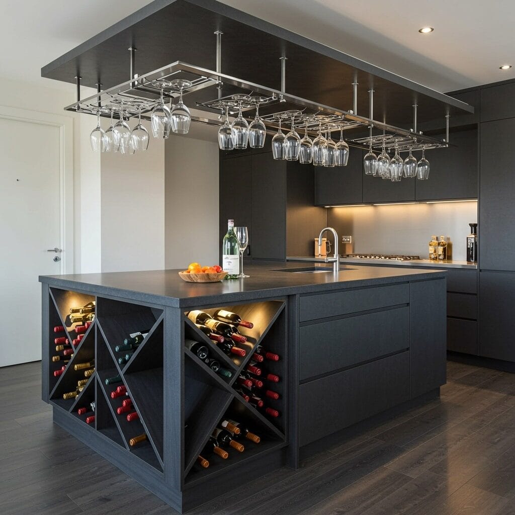 The key is making the wine storage both functional and beautiful – consider diagonal wine slots that display bottle labels or glass racks that catch and reflect light beautifully.
