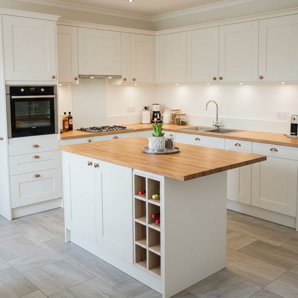 Corner islands work particularly well in L-shaped kitchens where they can bridge the gap between your two main work areas. They’re also perfect for adding a small prep sink or extra storage in tight spaces.