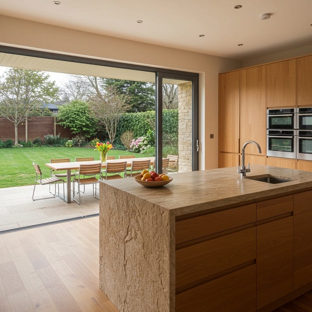 If your kitchen opens to a patio or deck, consider an island design that visually connects indoor and outdoor spaces. Natural materials like stone or weather-resistant wood can create seamless flow.
