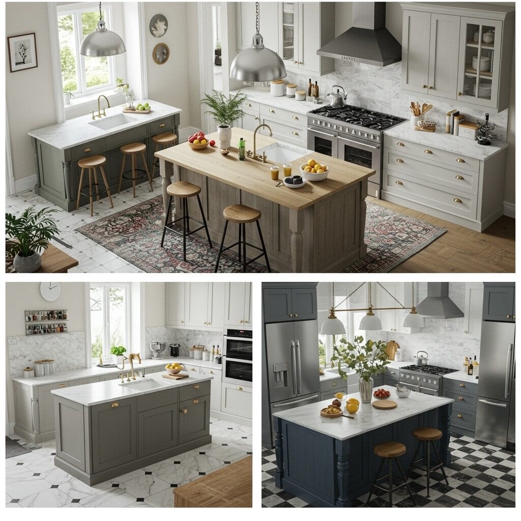 Combine different materials for visual interest – maybe a marble top with reclaimed wood base, or concrete counters with steel supports. This eclectic approach adds personality and prevents your kitchen from feeling too matchy-matchy.