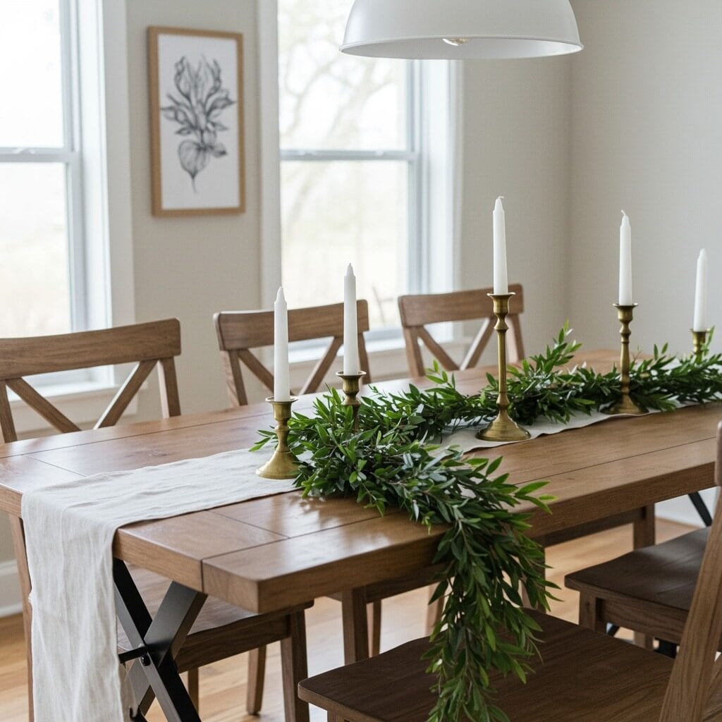 Your holiday dining doesn’t need elaborate centerpieces to feel special. Sometimes a simple runner made from eucalyptus garland with white candles placed along its length creates more elegance than any store-bought decoration.